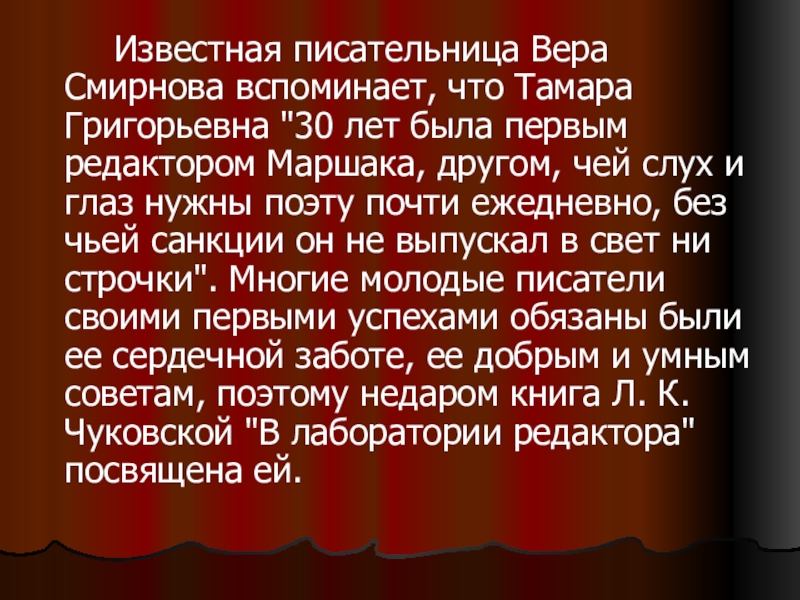 Слайд 9 Тамару Григорьевну очень ценили как талантливого литературного редактора. Она умела увидеть