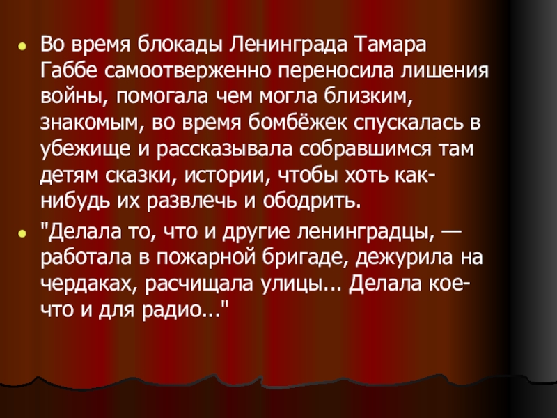 Слайд 8Во время блокады Ленинграда Тамара Габбе самоотверженно переносила лишения войны, помогала