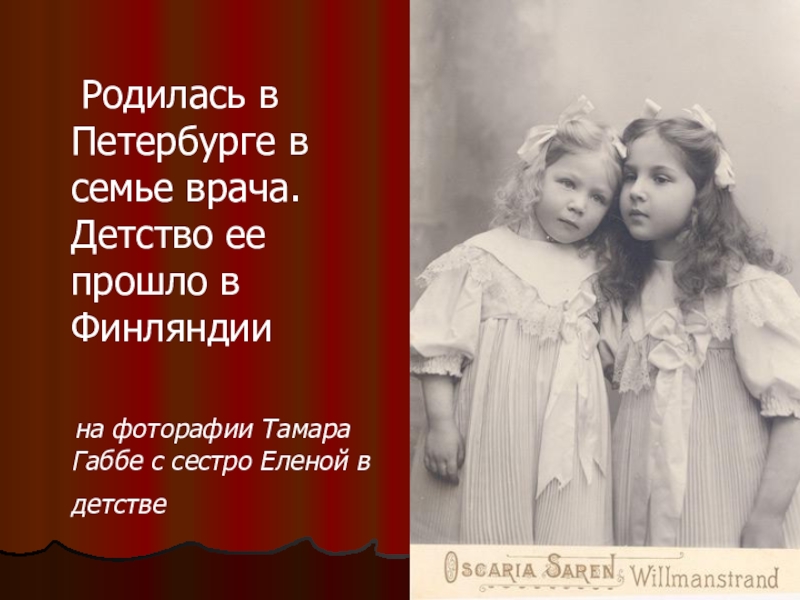 Родилась в Петербурге в семье врача. Детство ее прошло в Финляндии  на фоторафии Тамара Габбе с