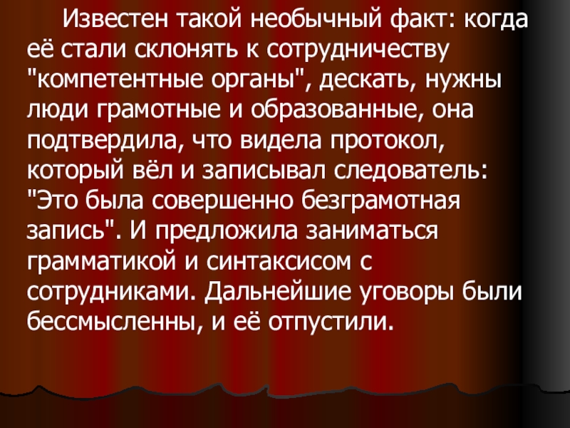 Слайд 7 Известен такой необычный факт: когда её стали склонять к сотрудничеству "компетентные