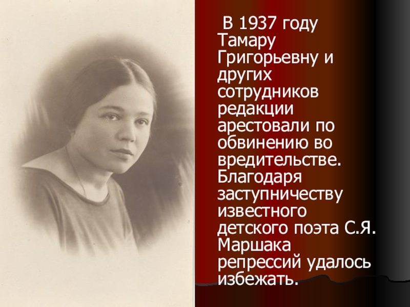Слайд 6 В 1937 году Тамару Григорьевну и других сотрудников редакции арестовали по