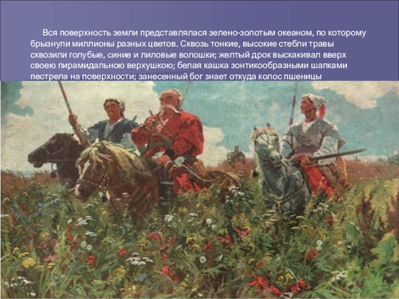 все то пространство, которое составляет нынешнюю Новороссию, до самого Черного моря, было зеленою, девственною пустынею. Никогда плуг не проходил по неизмеримым волнам диких растений. Одни только кони, скрывавшиеся в них, как в лесу, вытоптывали их. Ничего в природе не могло быть лучше.