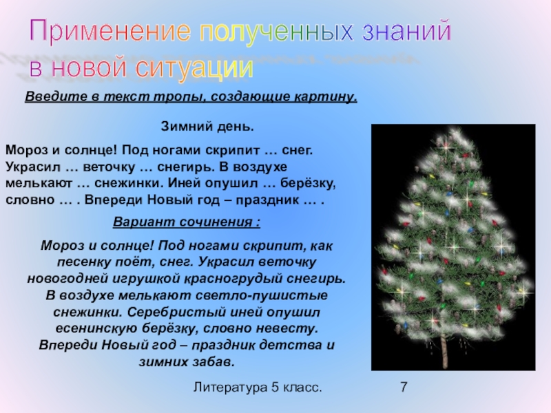 Мороз и солнце! Под ногами скрипит … снег. Украсил … веточку … снегирь. В воздухе мелькают … снежинки. Иней опушил … берёзку, словно … . Впереди Новый год – праздник … .