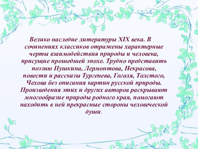 взаимодействия природы и человека, присущие прошедшей эпохе. Трудно представить поэзию Пушкина, Лермонтова, Некрасова, повести и рассказы Тургенева, Гоголя, Толстого, Чехова без описания картин русской природы. Произведения этих и других авторов раскрывают многообразие природы родного края, помогают находить в ней прекрасные стороны человеческой души.