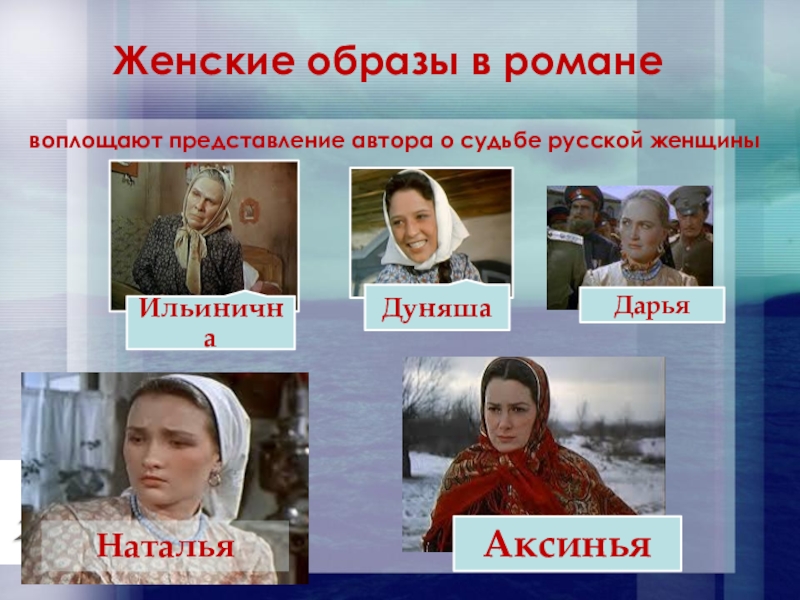 Ильинична - воплощение идеи материнства и единения всех людей /не делит мир на белых и красных/. Способна на любовь и сострадание к самым разным людям /даже к Кошевому и к Аксинье/.