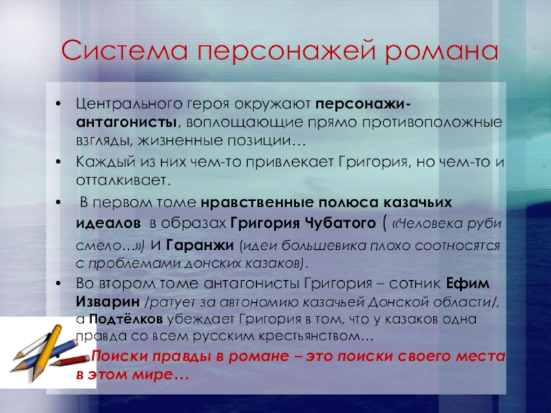 Во втором томе антагонисты Григория – сотник Ефим Изварин /ратует за автономию казачьей Донской области/, а Подтёлков убеждает Григория в том, что у казаков одна правда со всем русским крестьянством…