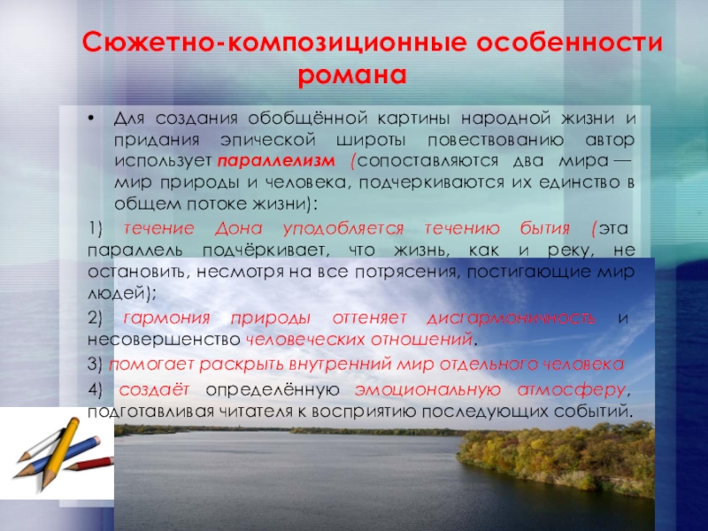 Для создания обобщённой картины народной жизни и придания эпической широты повествованию автор использует параллелизм (сопоставляются два мира — мир природы и человека, подчеркиваются их единство в общем потоке жизни):