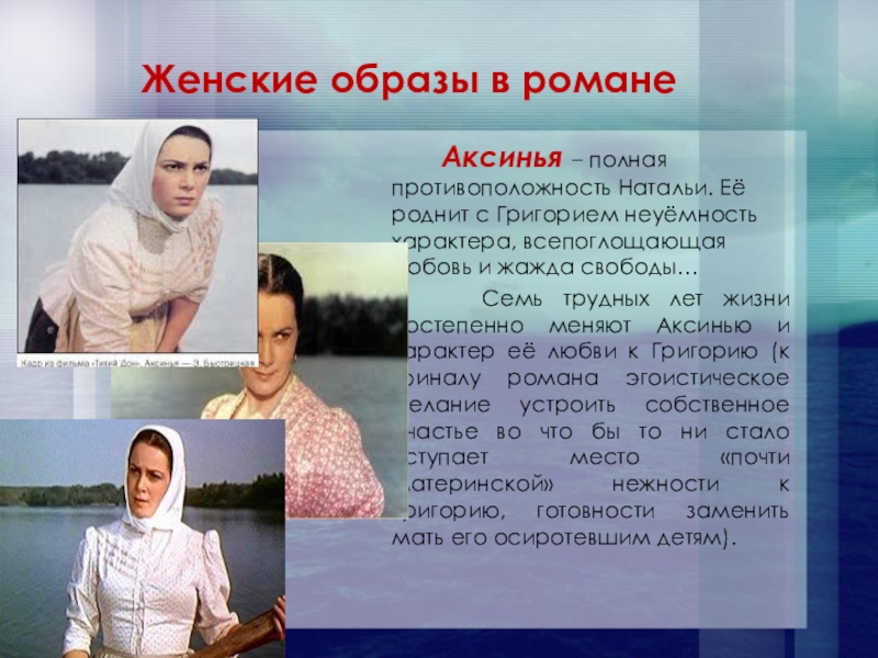 Семь трудных лет жизни постепенно меняют Аксинью и характер её любви к Григорию (к финалу романа эгоистическое желание устроить собственное счастье во что бы то ни стало уступает место «почти материнской» нежности к Григорию, готовности заменить мать его осиротевшим детям).