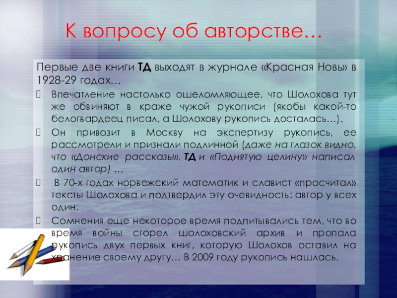 Сомнения еще некоторое время подпитывались тем, что во время войны сгорел шолоховский архив и пропала рукопись двух первых книг, которую Шолохов оставил на хранение своему другу… В 2009 году рукопись нашлась.