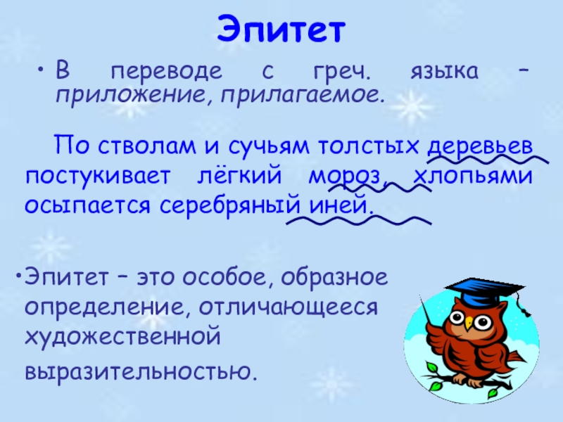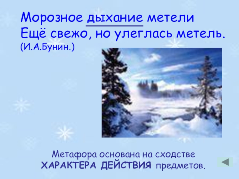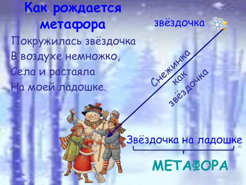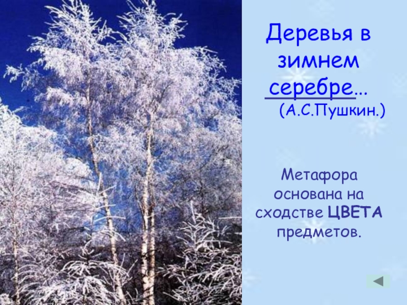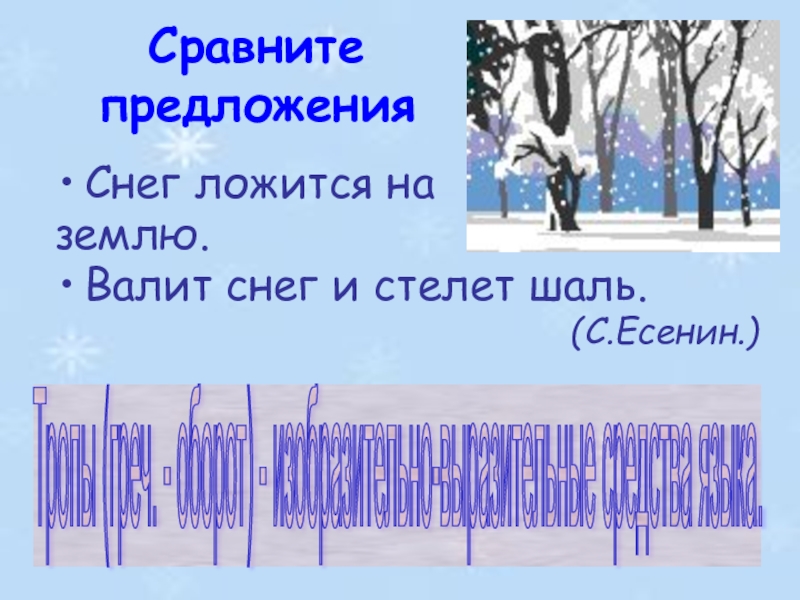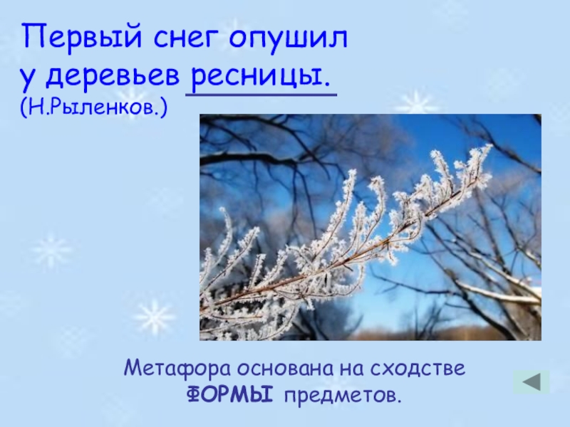 Первый снег опушил у деревьев ресницы. (Н.Рыленков.)