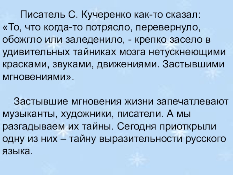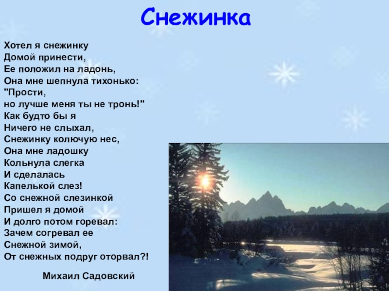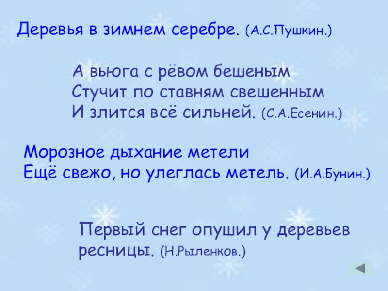 По стволам и сучьям толстых деревьев постукивает лёгкий мороз, хлопьями осыпается серебряный иней.