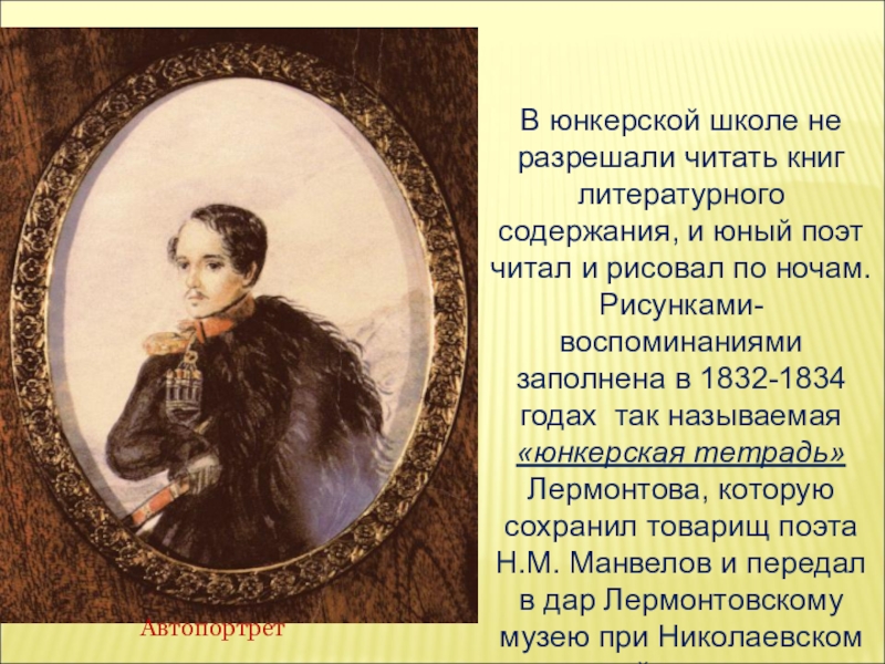 поэт читал и рисовал по ночам. Рисунками-воспоминаниями заполнена в 1832-1834 годах так называемая «юнкерская тетрадь» Лермонтова, которую сохранил товарищ поэта