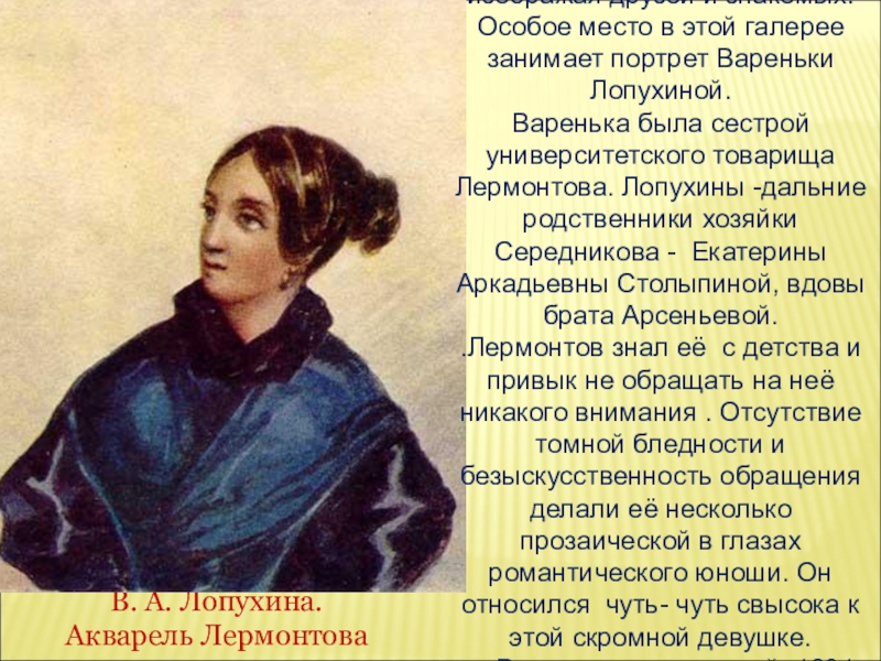 .Лермонтов знал её с детства и привык не обращать на неё никакого внимания . Отсутствие томной бледности и безыскусственность обращения делали её несколько прозаической в глазах романтического юноши. Он относился чуть- чуть свысока к этой скромной девушке.