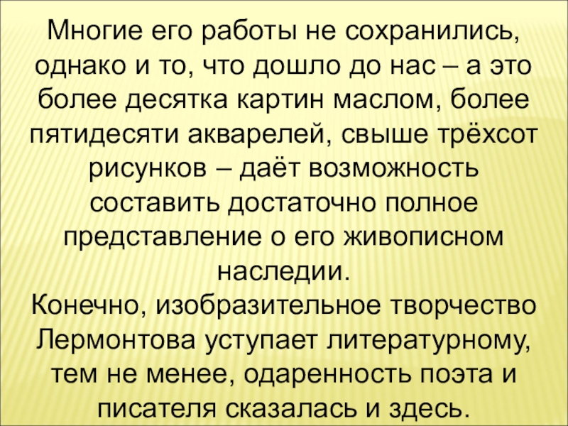 нас – а это более десятка картин маслом, более пятидесяти акварелей, свыше трёхсот рисунков – даёт возможность составить достаточно полное представление о его живописном наследии.