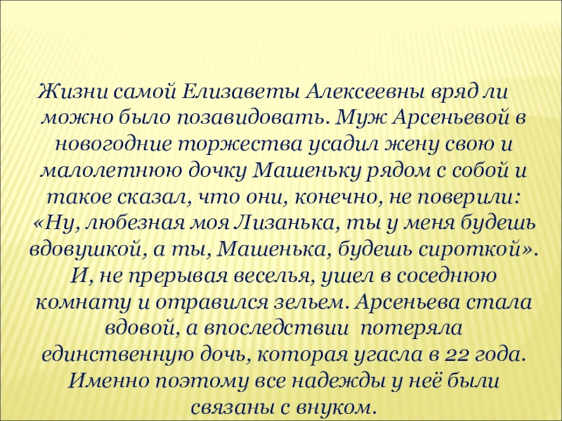 в новогодние торжества усадил жену свою и малолетнюю дочку Машеньку рядом с собой и такое сказал, что они, конечно, не поверили: «Ну, любезная моя Лизанька, ты у меня будешь вдовушкой, а ты, Машенька, будешь сироткой». И, не прерывая веселья, ушел в соседнюю комнату и отравился зельем. Арсеньева стала вдовой, а впоследствии потеряла единственную дочь, которая угасла в 22 года. Именно поэтому все надежды у неё были связаны с внуком.