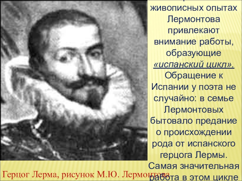 опытах Лермонтова привлекают внимание работы, образующие «испанский цикл». Обращение к Испании у поэта не случайно: в семье Лермонтовых бытовало предание о происхождении рода от испанского герцога Лермы. Самая значительная работа в этом цикле – «Портрет герцога Лермы».