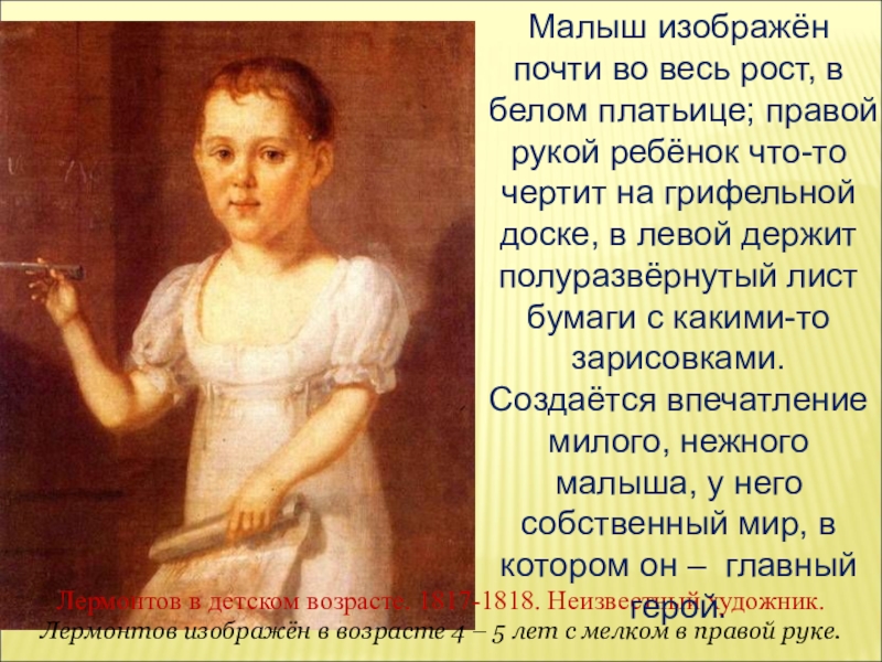 Малыш изображён почти во весь рост, в белом платьице; правой рукой ребёнок что-то чертит на грифельной доске, в левой держит полуразвёрнутый лист бумаги с какими-то зарисовками. Создаётся впечатление милого, нежного малыша, у него собственный мир, в котором он – главный герой.