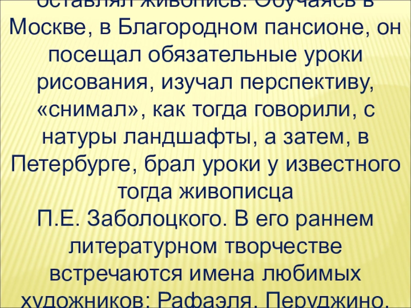 П.Е. Заболоцкого. В его раннем литературном творчестве встречаются имена любимых художников: Рафаэля, Перуджино, Рембранта.