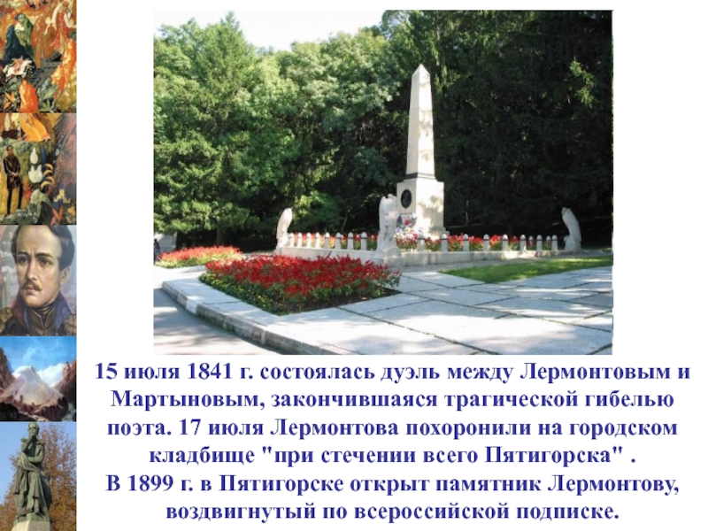 трагической гибелью поэта. 17 июля Лермонтова похоронили на городском кладбище "при стечении всего Пятигорска" .