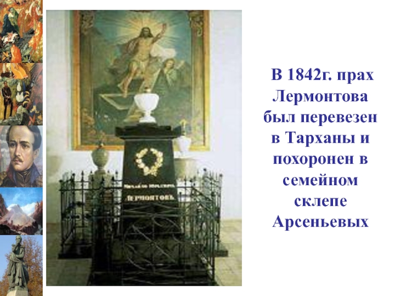 Слайд 17 В 1842г. прах Лермонтова был перевезен в Тарханы и похоронен