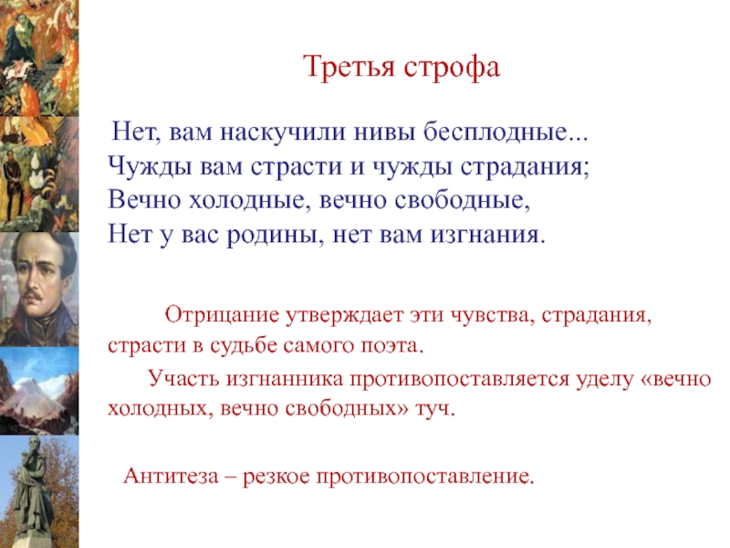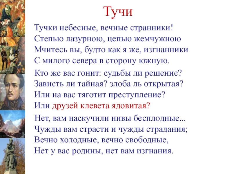 Участь изгнанника противопоставляется уделу «вечно холодных, вечно свободных» туч.