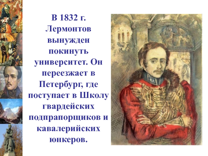 Слайд 7В 1832 г. Лермонтов вынужден покинуть университет. Он переезжает в Петербург,