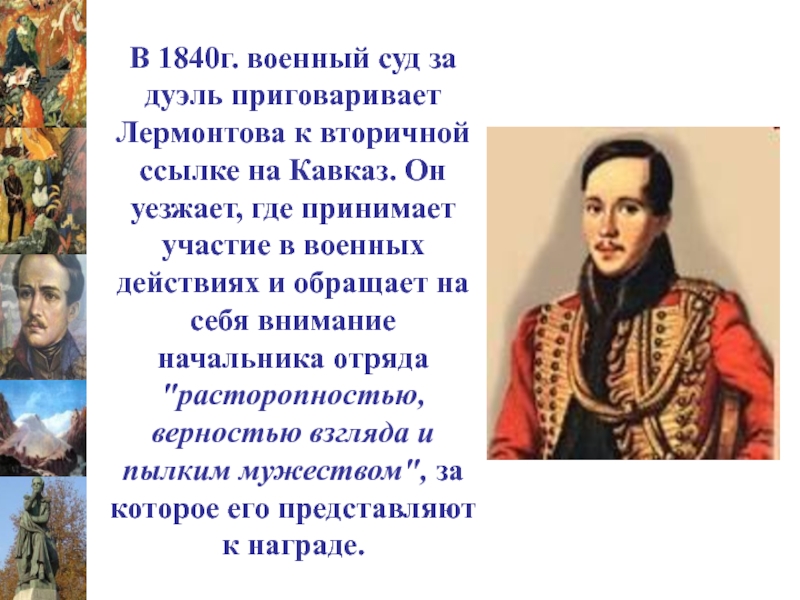 Слайд 10В 1840г. военный суд за дуэль приговаривает Лермонтова к вторичной ссылке