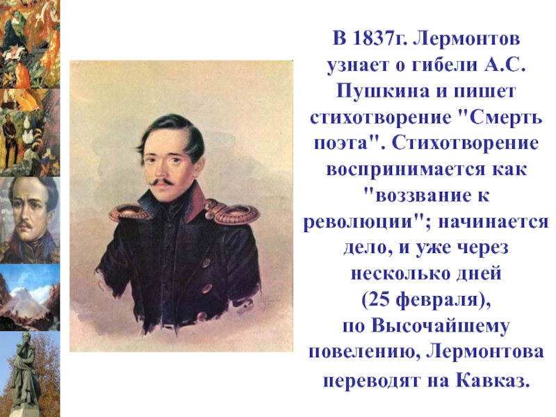 Слайд 9В 1837г. Лермонтов узнает о гибели А.С.Пушкина и пишет стихотворение "Смерть
