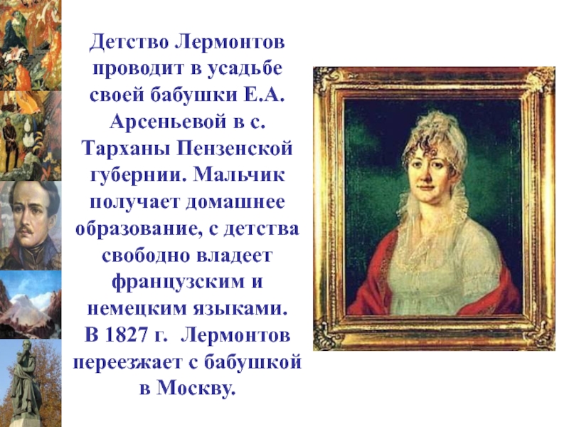 Слайд 5Детство Лермонтов проводит в усадьбе своей бабушки Е.А.Арсеньевой в с.Тарханы Пензенской