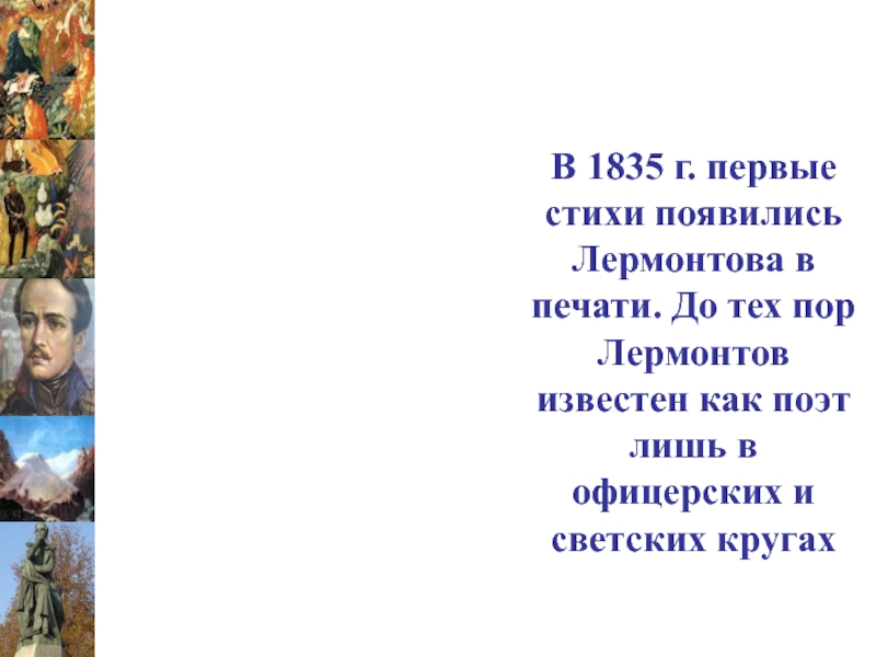 Слайд 8В 1835 г. первые стихи появились Лермонтова в печати. До тех