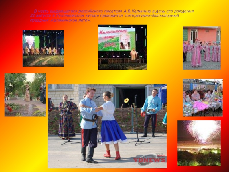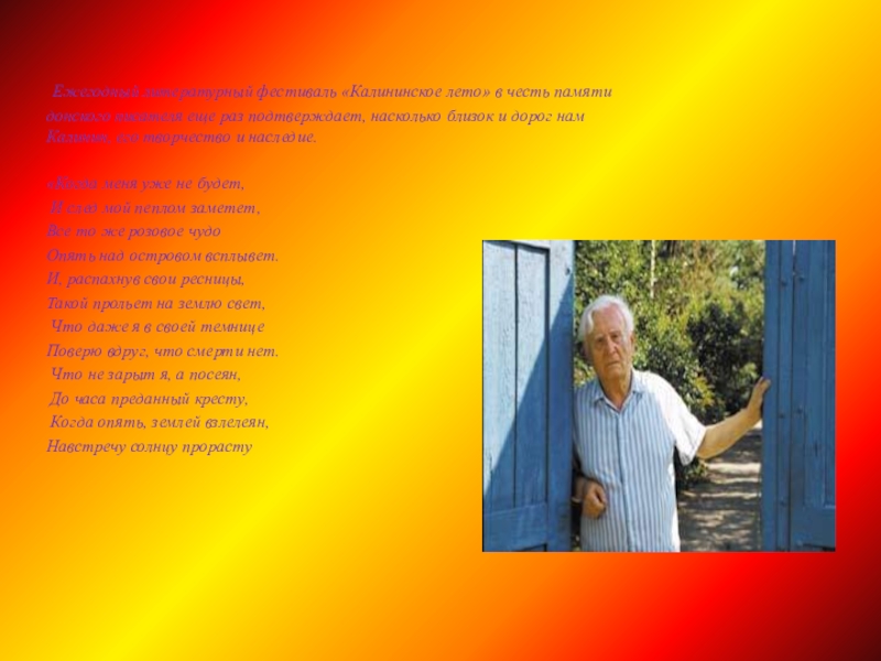 Слайд 13 Ежегодный литературный фестиваль «Калининское лето» в честь памяти донского писателя