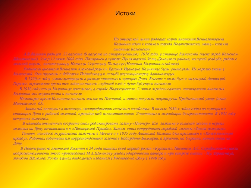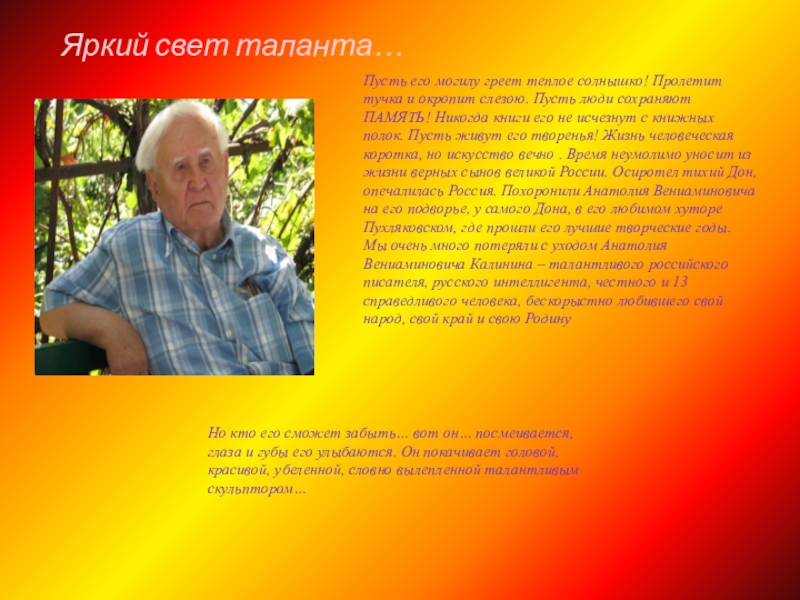Пусть люди сохраняют ПАМЯТЬ! Никогда книги его не исчезнут с книжных полок. Пусть живут его творенья! Жизнь человеческая коротка, но искусство вечно . Время неумолимо уносит из жизни верных сынов великой России. Осиротел тихий Дон, опечалилась Россия. Похоронили Анатолия Вениаминовича на его подворье, у самого Дона, в его любимом хуторе Пухляковском, где прошли его лучшие творческие годы. Мы очень много потеряли с уходом Анатолия Вениаминовича Калинина – талантливого российского писателя, русского интеллигента, честного и 13 справедливого человека, бескорыстно любившего свой народ, свой край и свою Родину