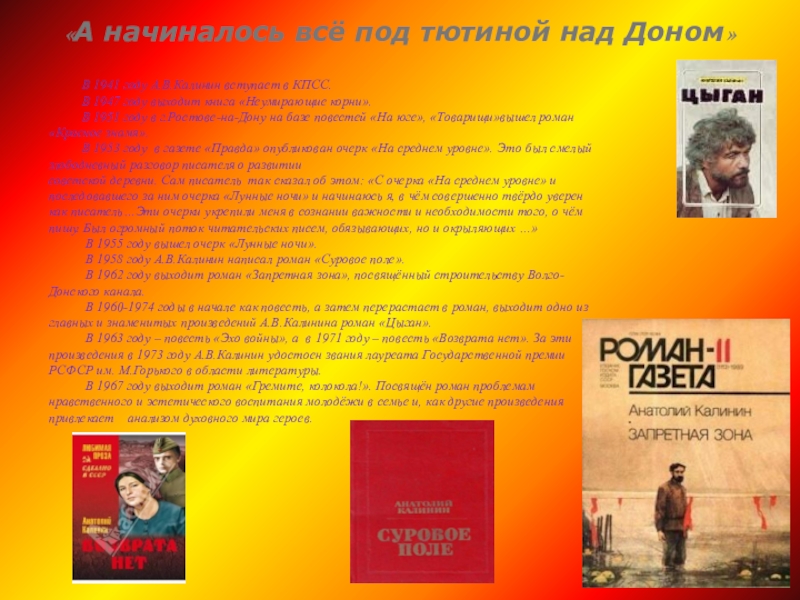 В 1960-1974 годы в начале как повесть, а затем перерастает в роман, выходит одно из главных и знаменитых произведений А.В.Калинина роман «Цыган».