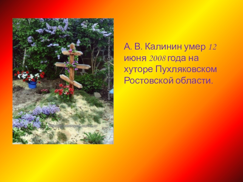 Слайд 18А. В. Калинин умер 12 июня 2008 года на хуторе Пухляковском