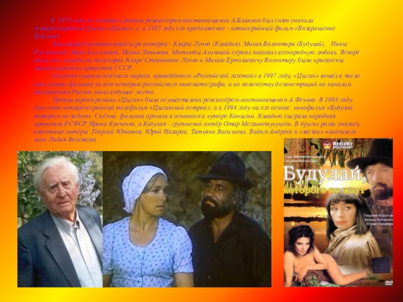 В 1979 году по мотивам романа режиссером-постановщиком А.Бланком был снят сначала четырёхсерийный фильм «Цыган», а в 1985 году его продолжение - пятисерийный фильм «Возвращение Будулая».