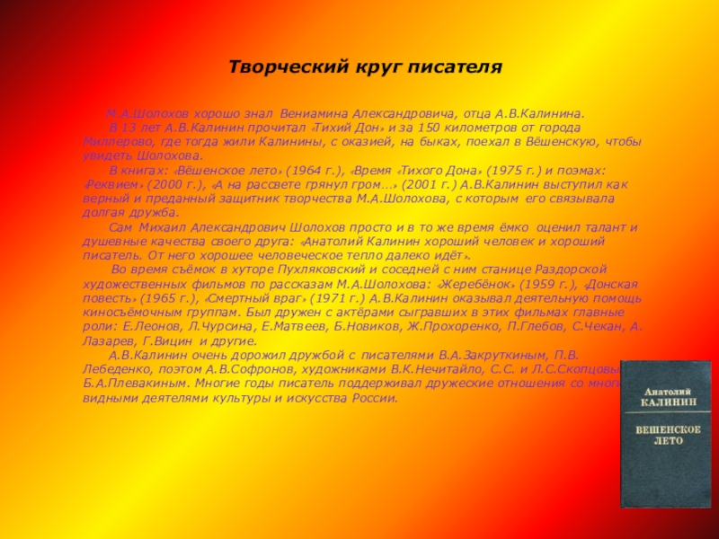 М.А.Шолохов хорошо знал Вениамина Александровича, отца А.В.Калинина.