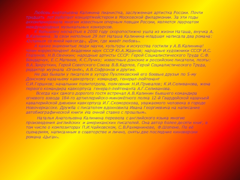 Слайд 11 Любовь Анатольевна Калинина пианистка, заслуженная артистка России. Почти тридцать лет