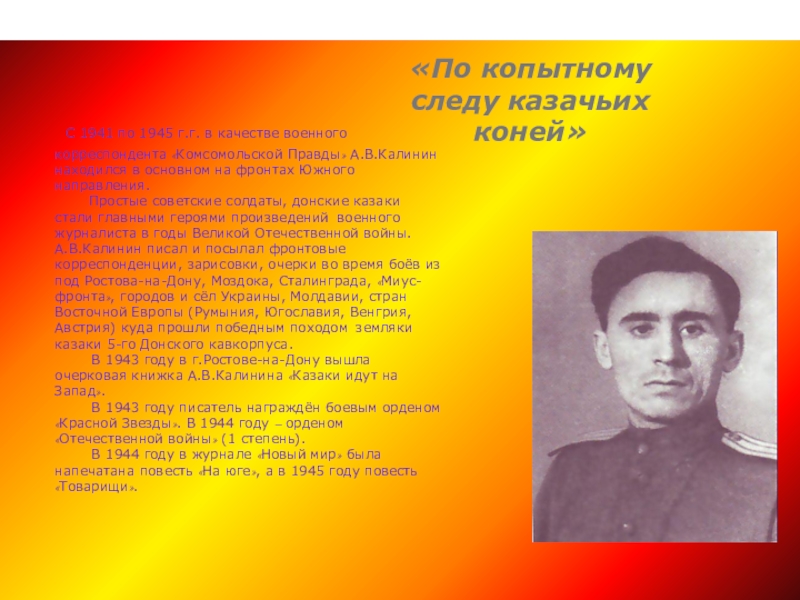 качестве военного корреспондента «Комсомольской Правды» А.В.Калинин находился в основном на фронтах Южного направления.