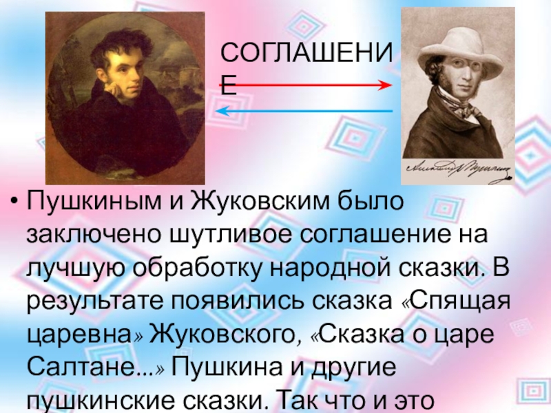 Слайд 10Пушкиным и Жуковским было заключено шутливое соглашение на лучшую обработку народной