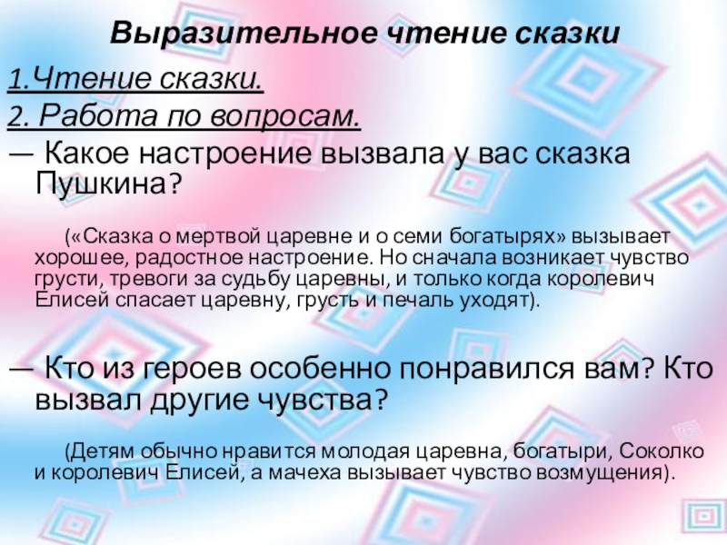 (Детям обычно нравится молодая царевна, богатыри, Соколко и королевич Елисей, а мачеха вызывает чувство возмущения).