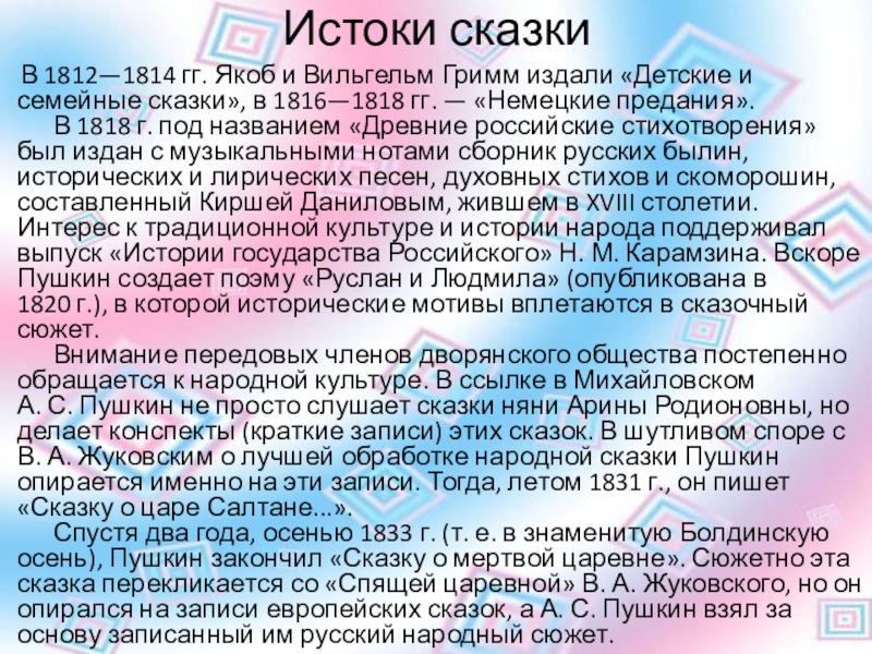 Внимание передовых членов дворянского общества постепенно обращается к народной культуре. В ссылке в Михайловском А. С. Пушкин не просто слушает сказки няни Арины Родионовны, но делает конспекты (краткие записи) этих сказок. В шутливом споре с В. А. Жуковским о лучшей обработке народной сказки Пушкин опирается именно на эти записи. Тогда, летом 1831 г., он пишет «Сказку о царе Салтане...».
