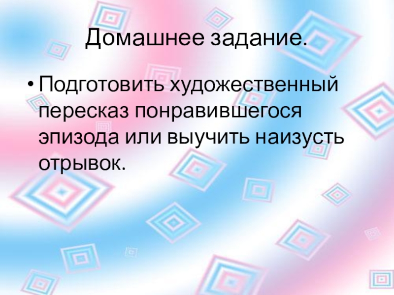 Подготовить художественный пересказ понравившегося эпизода или выучить наизусть отрывок.