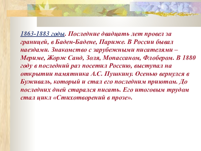 1853-1860 годы. Жизнь в Спасском-Лутовинове, плодотворная работа. Романы «Рудин» (1856), «Дворянское гнездо» (1858), «Накануне» (1860)