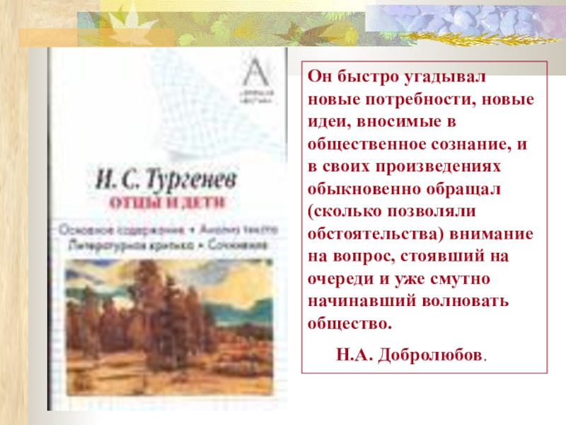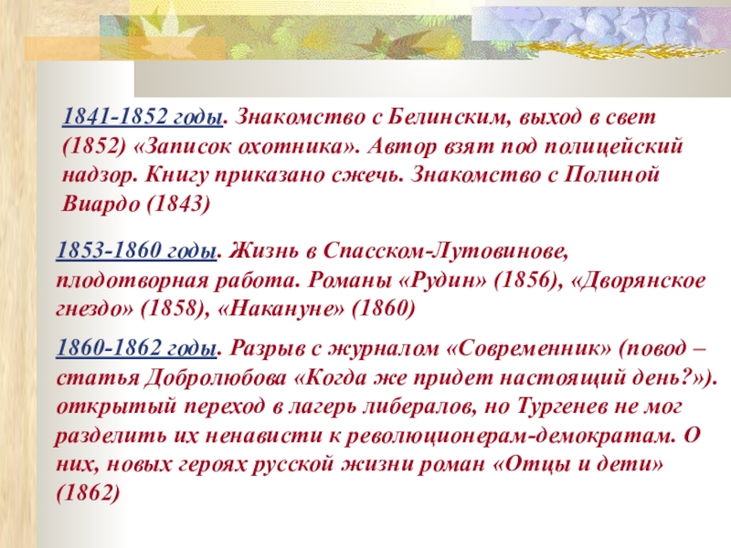 1860-1862 годы. Разрыв с журналом «Современник» (повод – статья Добролюбова «Когда же придет настоящий день?»). открытый переход в лагерь либералов, но Тургенев не мог разделить их ненависти к революционерам-демократам. О них, новых героях русской жизни роман «Отцы и дети» (1862)