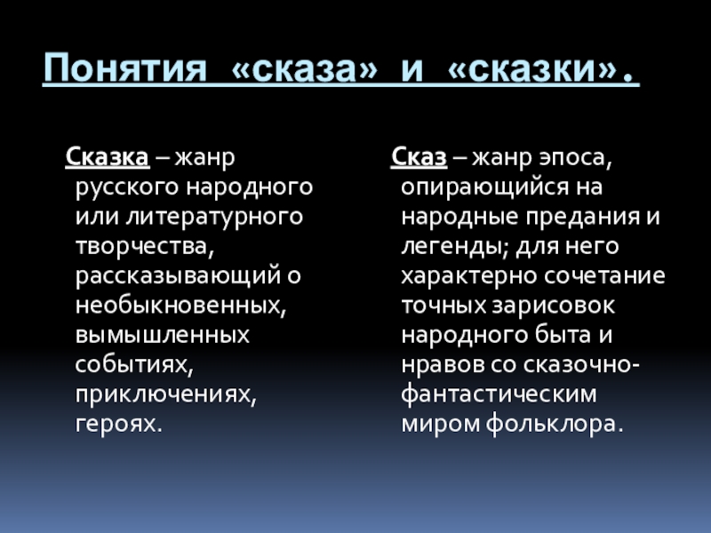 Сказ – жанр эпоса, опирающийся на народные предания и легенды; для него характерно сочетание точных зарисовок народного быта и нравов со сказочно-фантастическим миром фольклора.