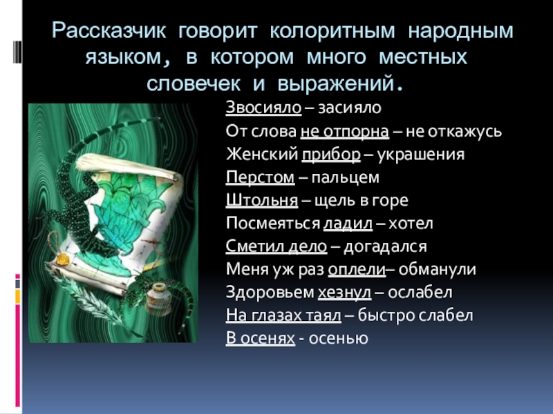 Слайд 4Колоритный народный язык – отличительная особенность сказа