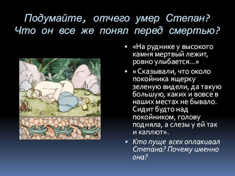 « Сказывали, что около покойника ящерку зеленую видели, да такую большую, каких и вовсе в наших местах не бывало. Сидит будто над покойником, голову подняла, а слезы у ей так и каплют».