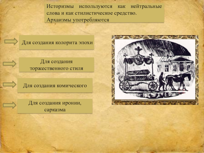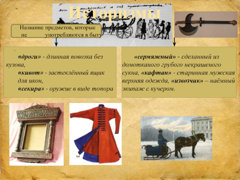 «сермяжный» - сделанный из домотканого грубого некрашеного сукна, «кафтан» - старинная мужская верхняя одежда, «извозчик» – наёмный экипаж с кучером.