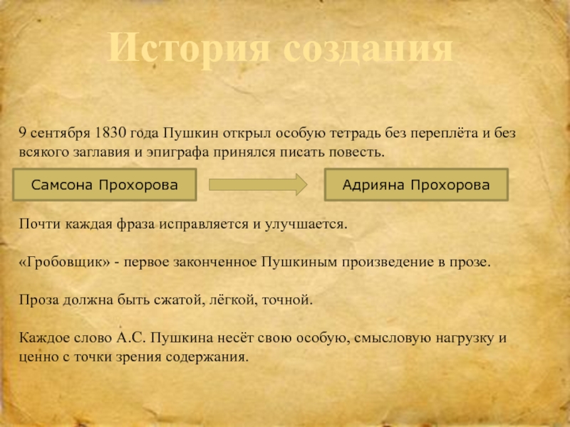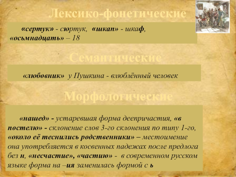 «нашед» - устаревшая форма деепричастия, «в постелю» - склонение слов 3-го склонения по типу 1-го, «около её теснились родственники» – местоимение она употребляется в косвенных падежах после предлога без н, «несчастие», «частию» - в современном русском языке форма на –ия заменилась формой с ь