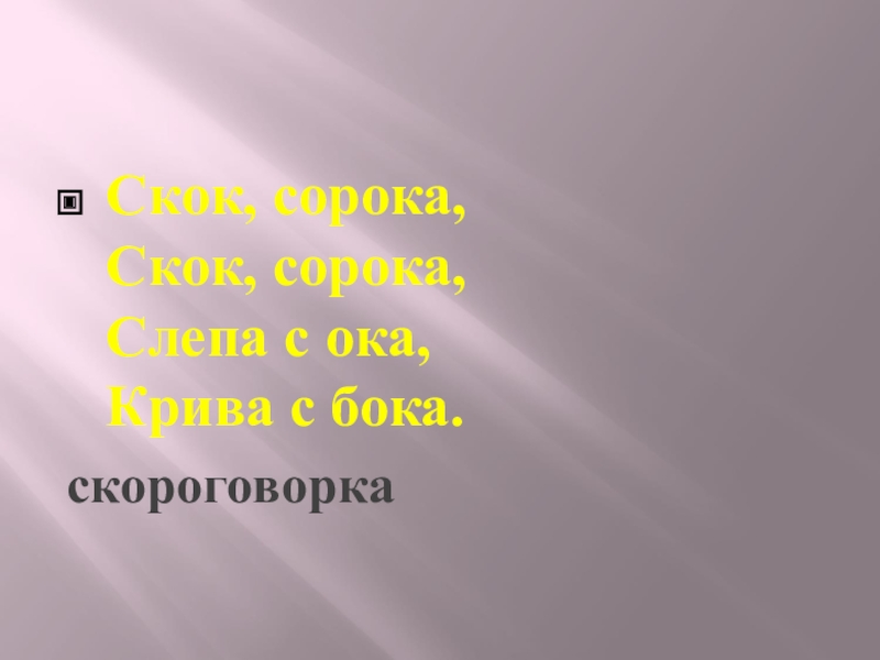 Скок, сорока,  Скок, сорока,  Слепа с ока,  Крива с бока.скороговорка